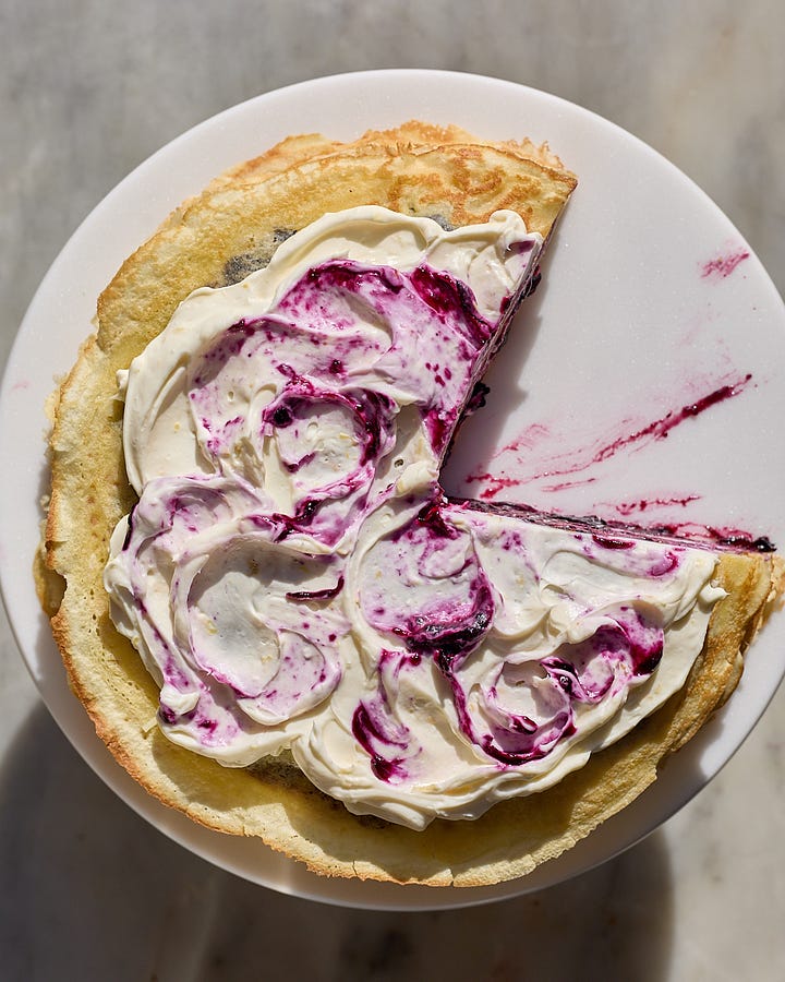 I’ve had crepe cakes on the brain. Last week, I was fighting with a black sesame crepe cake that I’m just not sure will ever see the light of day. I was working on a cream cheese filling for that recipe when, halfway through, I thought, this would be way better with blueberries. I started thinking about blintzes, the Eastern European Jewish dish comprised of a creamy filling wrapped in a thin pancake and baked, often topped with a berry sauce. This blueberry crepe cake became a play on that delicious breakfast/brunch fare — and to take it over the top, lemon juice and lemon zest flavor the crepe batter and cream cheese filling.
