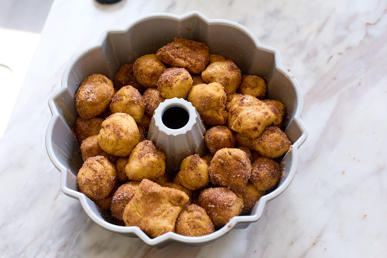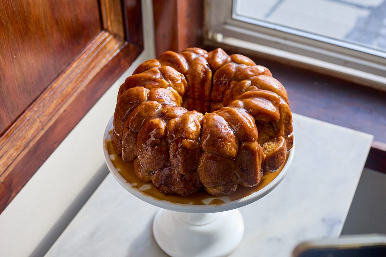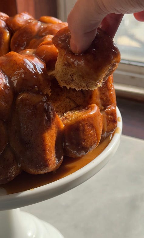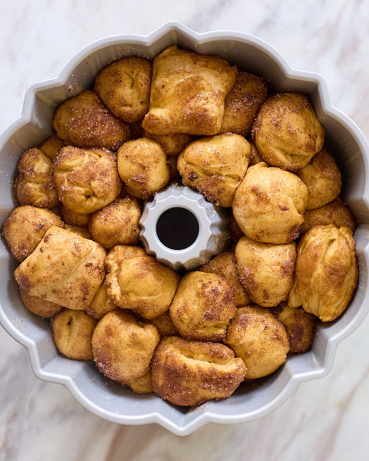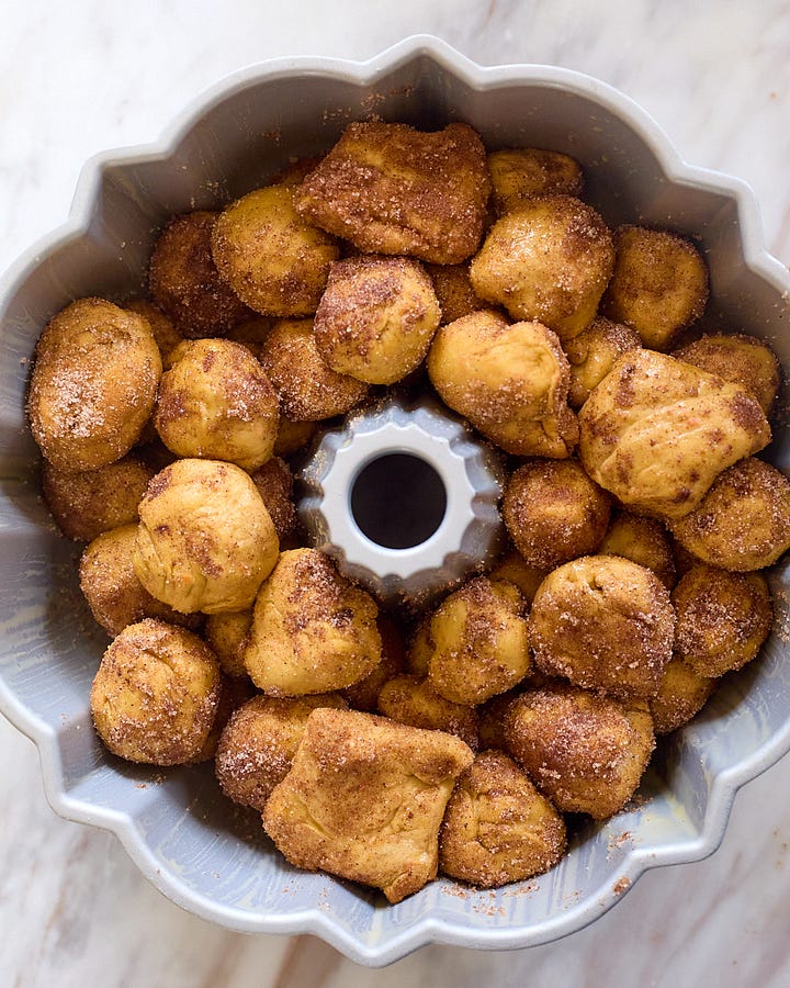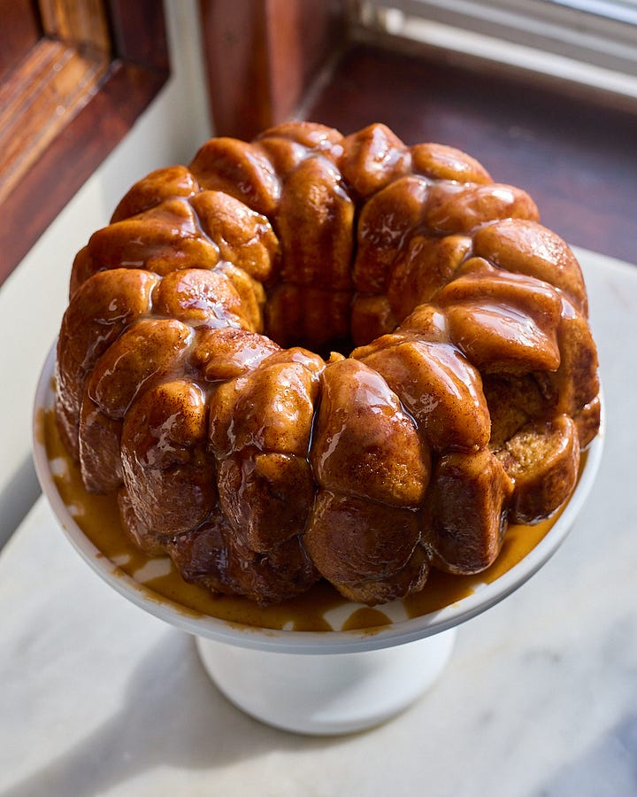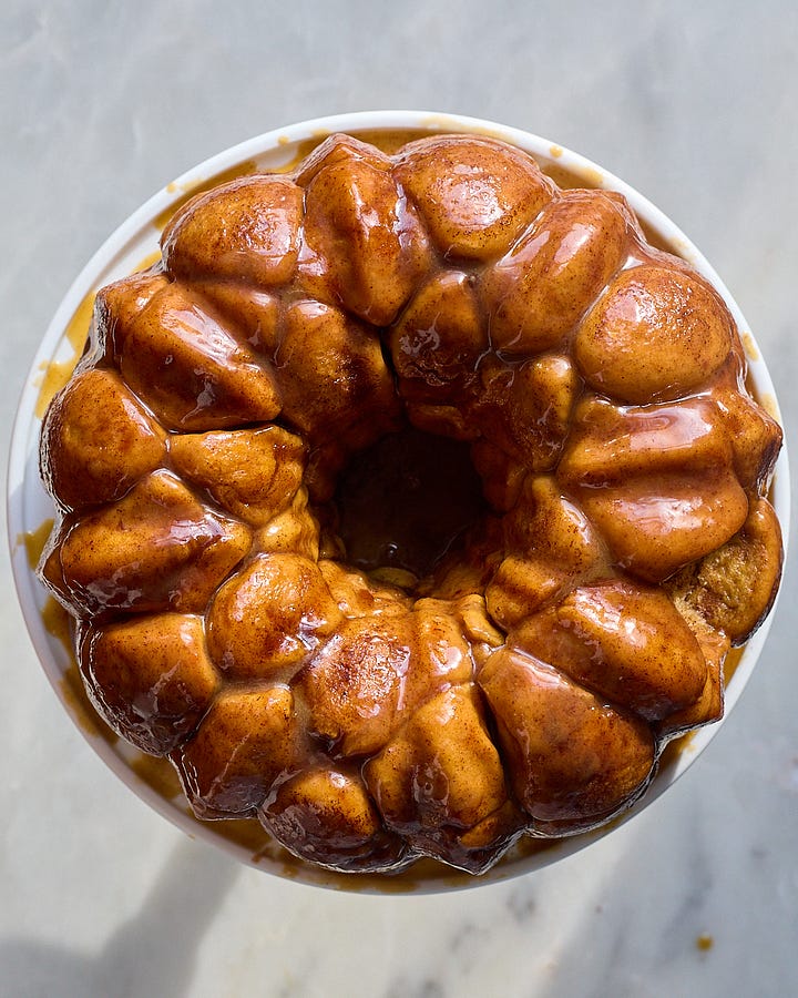 This recipe is the perfect centerpiece for a brunch where you want to impress — or just a slow morning of your family picking pieces off one by one. If you don’t have a bundt pan, you can also bake it in a large cast iron skillet, two cake tins, two loaf tins, or a 9x13-inch pan. If you’re really crazy and out there, you could even try adding a cup or so of raisins to the dough — or sprinkle the top with toasted chopped pecans.
