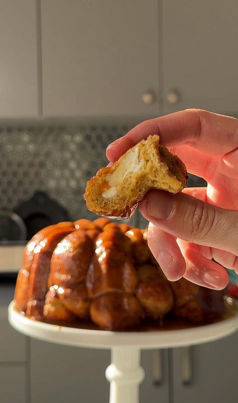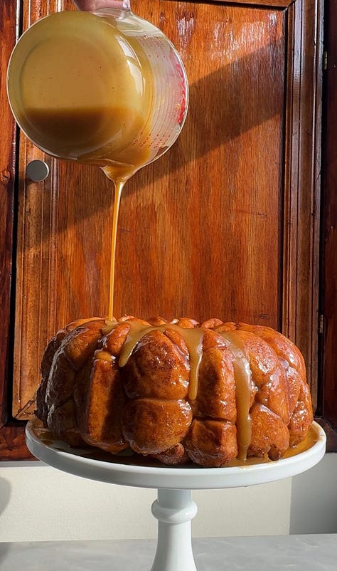Then things take a turn from the traditional with some salty, buttery toffee sauce that gets poured onto the monkey bread bottom-side up right when it comes out of the oven, and then over the top once it gets turned out.
