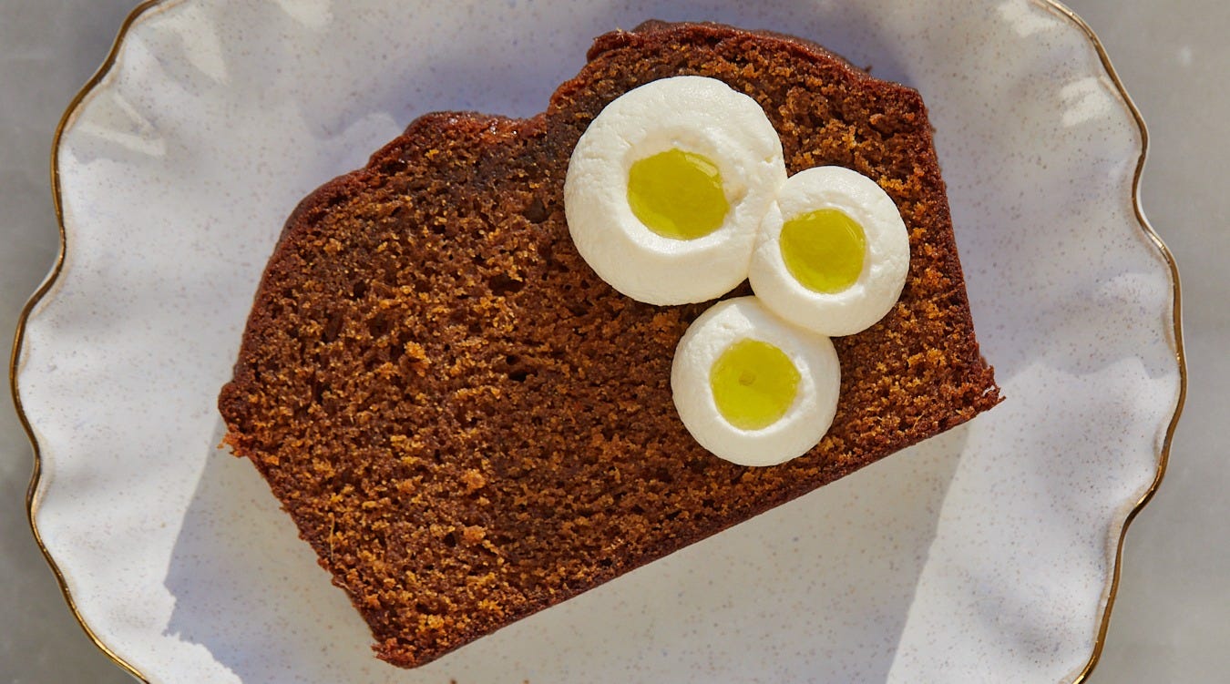 Top slices of the loaf cake with mascarpone cream. Drizzle with olive oil.