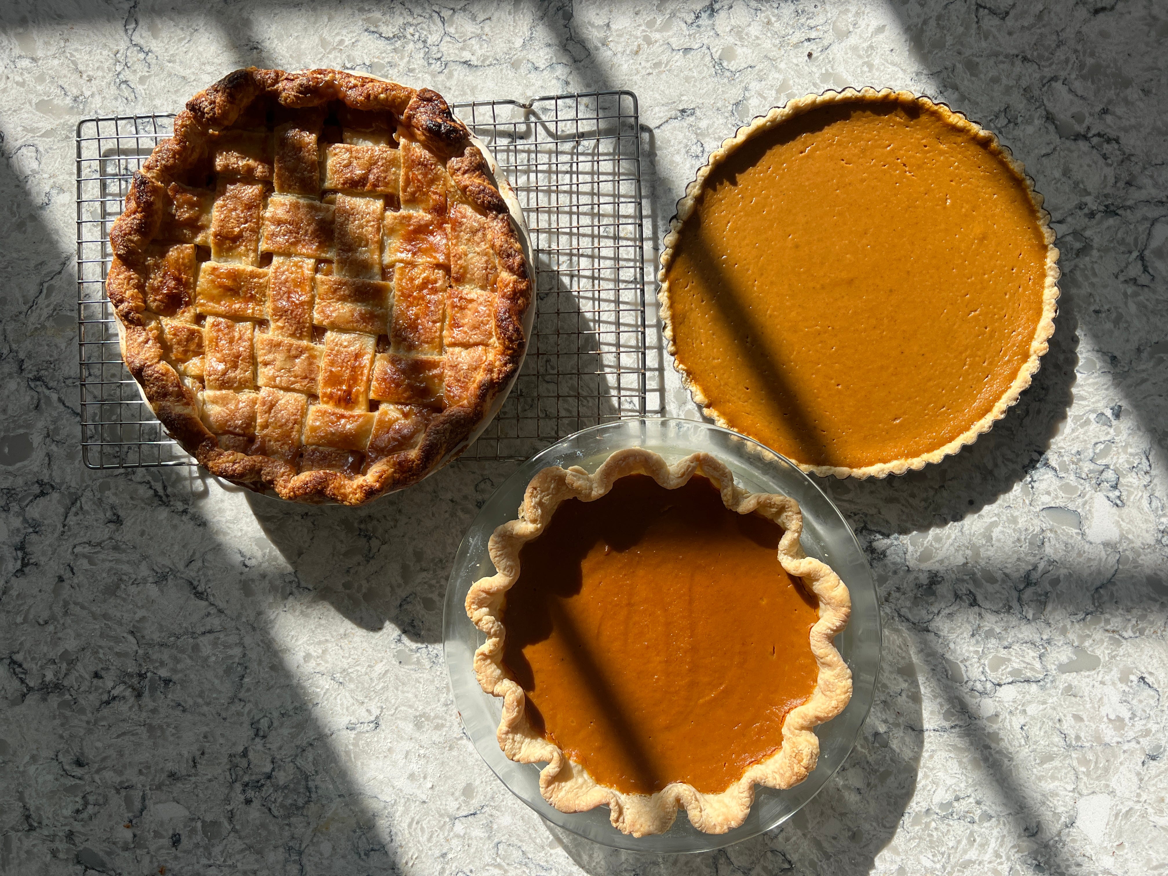 And here’s a picture of my Thanksgiving pies this year in case you missed them. Apple pie from Erin McDowell’s The Book on Pie (this link is to her caramel apple pie because that seems to be the only one online), her pumpkin pie as well (for both of them I used my crust from the peach-mango ginger pie), and my pumpkin tart.