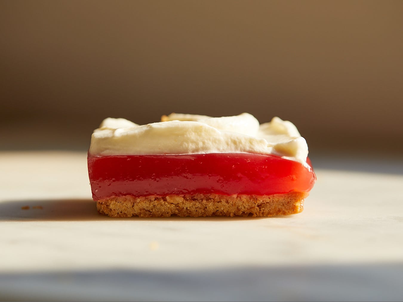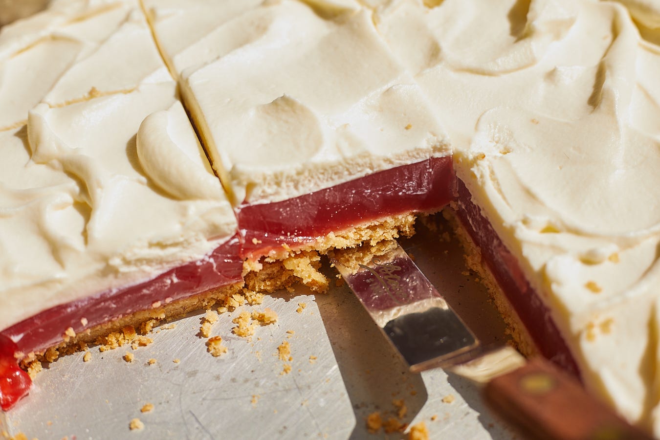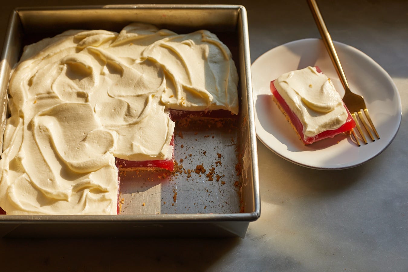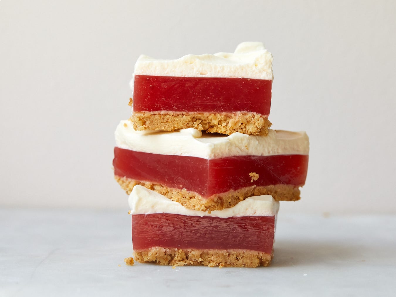 So let me tell you more about the recipe. The base is a shortbread crust made with crushed up pretzel crumbs. I tried it with foil and parchment lining the tin because I thought it would be easier to lift them out and cut them, but those both made it easier for the liquid to seep into the crevices and soften up the crust. Serving them straight out of the tin is easy, though! Then we have the watermelon-strawberry gelatin, which is made with fresh fruit and powdered gelatin. Watermelon doesn’t have a strong flavor so I’m amping it up with some strawberries that get cooked down and strained (I like to put the discarded strawberries on salad or ice cream!) and I promise you can taste both when it’s all said and done.