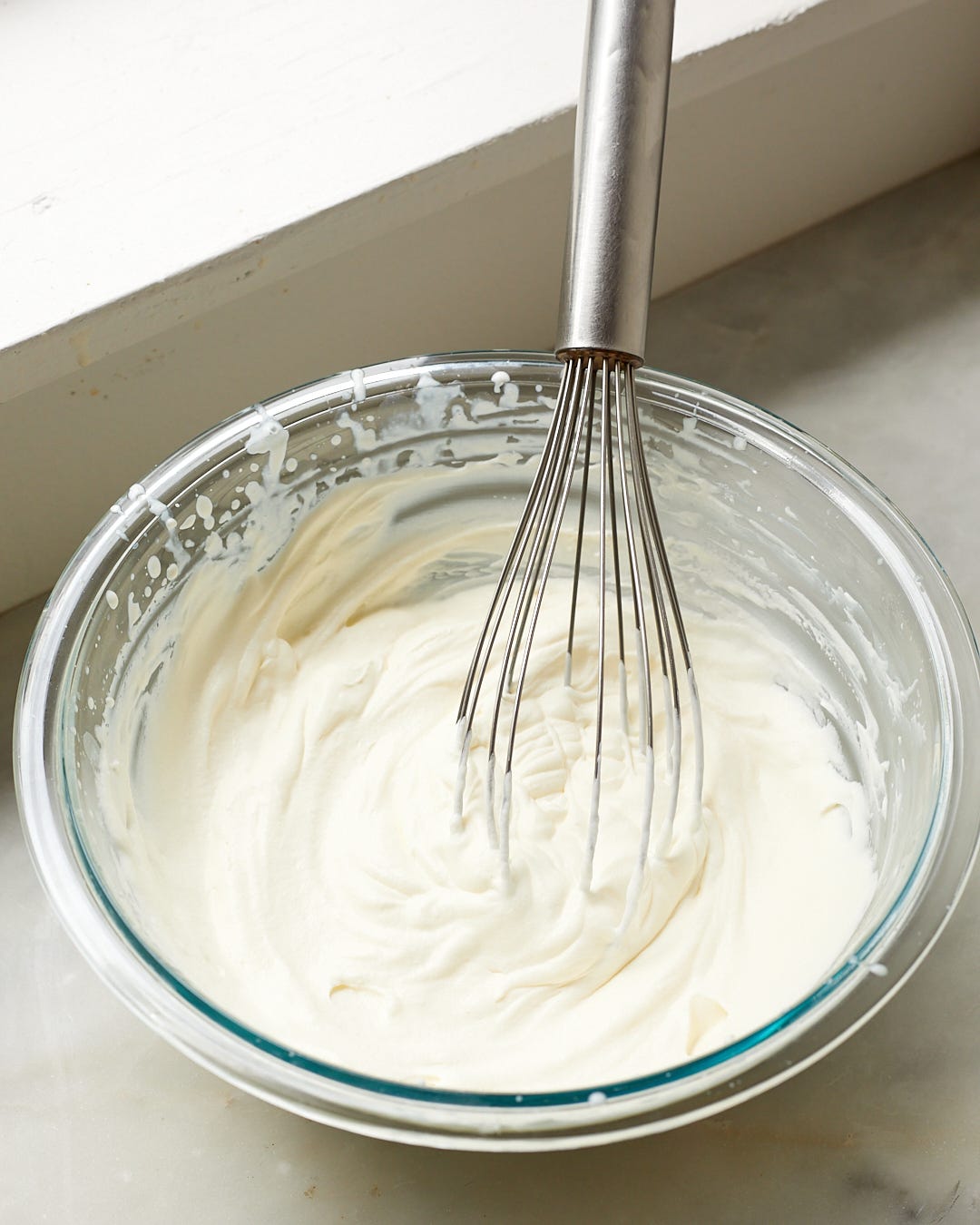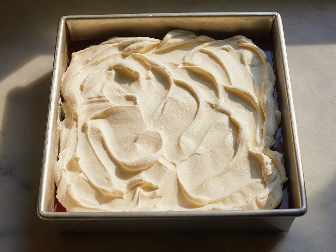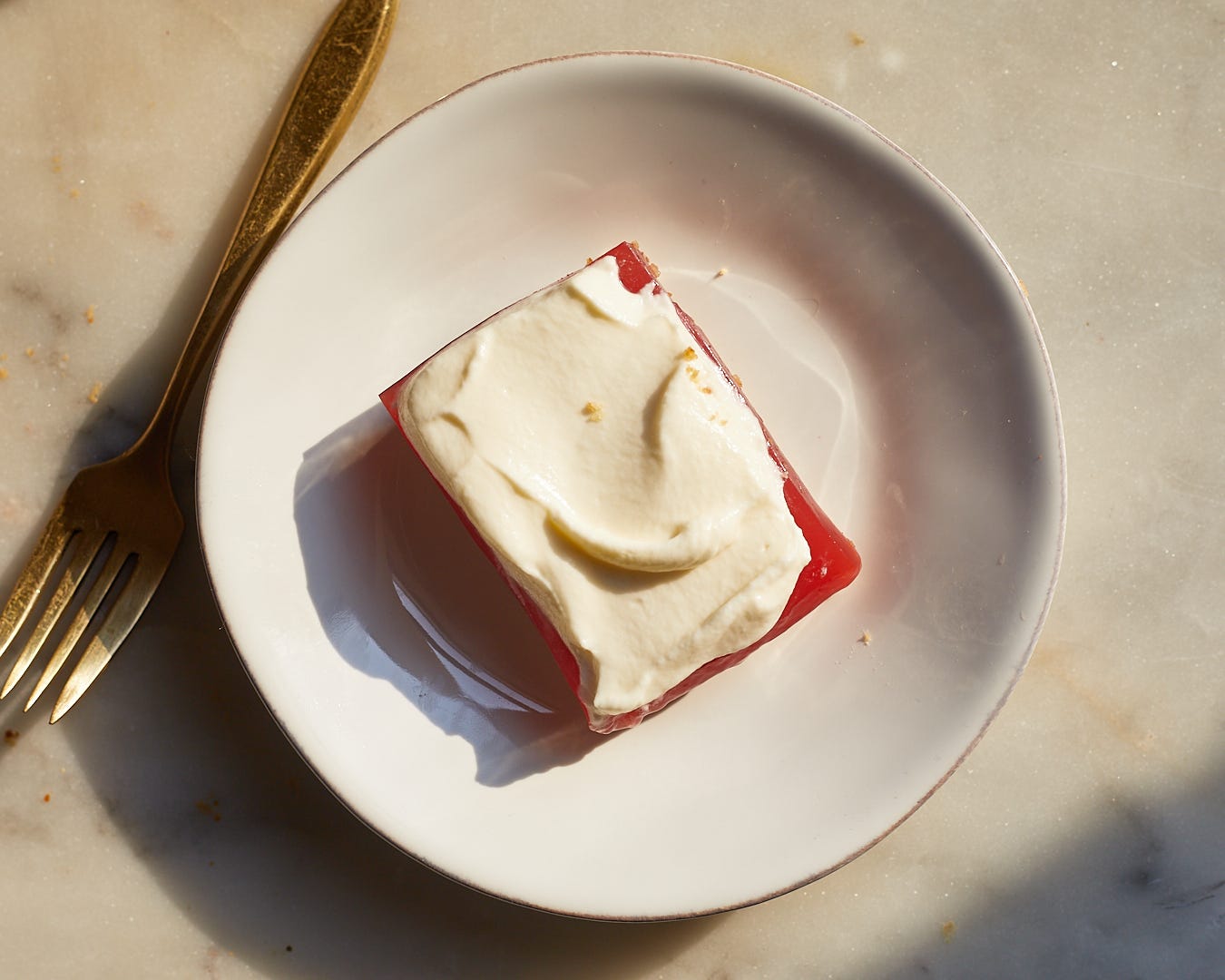 When the jello has set, make the topping. In a medium mixing bowl, whisk together the crème fraîche, heavy cream, powdered sugar, and a pinch of salt, whipping to stiff peaks. You can also use a hand mixer for this.