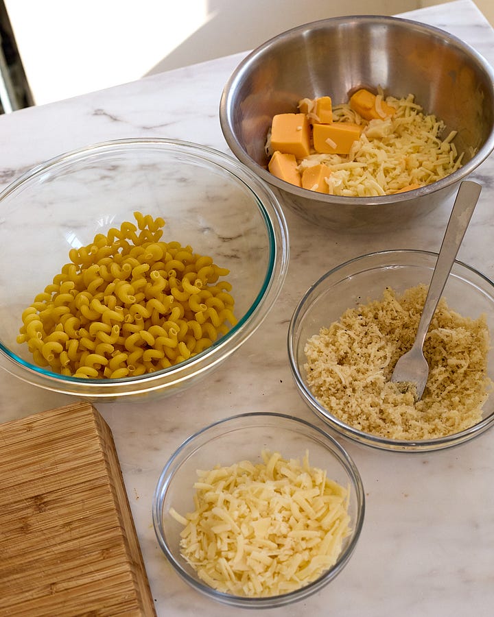 I give exact quantities for the types of cheese in my recipe, but use that more as a guide to adjust to your flavor preferences. I realize buying four or five different types of cheese is a lot of money; there’s no reason you couldn’t do this with 2 or 3 different cheeses in the sauce (for example, cheddar and American). You can also forgo the parm in the breadcrumb topping — or just top the mac with a layer of more cheddar. I recommend having a good balance of cheeses — soft, semi-soft, semi-hard and hard — across different components of mac ‘n’ cheese. Here is a non-exhaustive list: