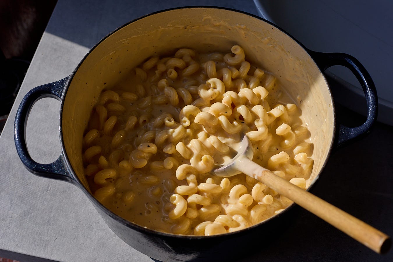 This also means being patient. If you’re cooking in a Dutch oven, the residual heat from the cast iron will probably be enough to melt the cheese, so just give it time. I usually add the cheese off the stove, but if you need, stick it over the still-hot burner to use up some of that heat. If that’s still enough, I turn the burner to the lowest it will go and stir for just a minute or two. And if your sauce still has some bits of visible cheese floating around, that’s okay! It will melt in the oven, or even better, turn into a gorgeous melty strand when a spoonful of hot mac is lifted out of the dish.